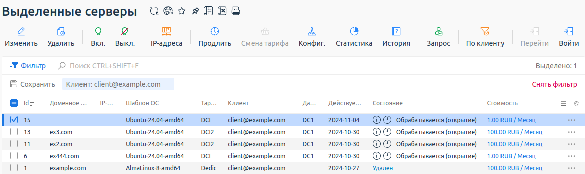 - Удалить — удалить сервер. Провайдер удалит услугу и отправит запрос на удаление ВС в DCImanager 6;