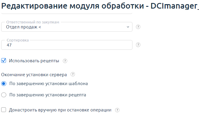 - Использовать рецепты — если флаг активен, при заказе услуги клиент сможет выбрать подходящий рецепт: на странице заказа услуги появится поле "Предустановленное ПО". Услуга в Clouden получит статус "Активна" после успешного завершения установки рецепта на выбранную ОС.