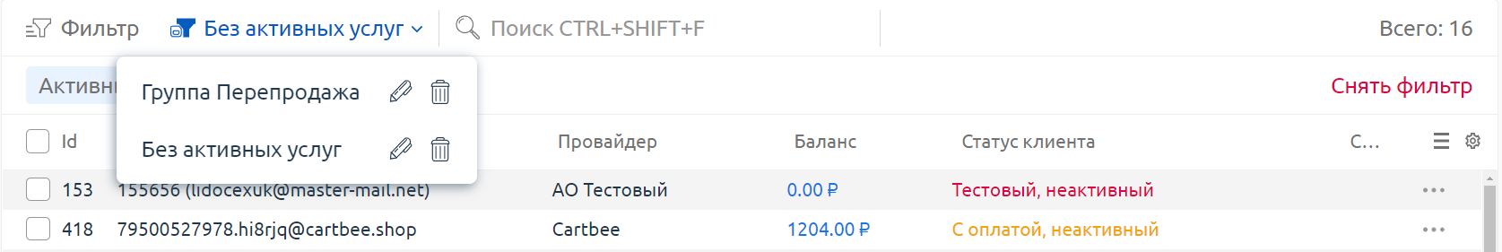 Вы можете задать условия отбора данных для отображения в таблице. Для каждой таблицы набор параметров и сохранённых фильтров будет отличаться.