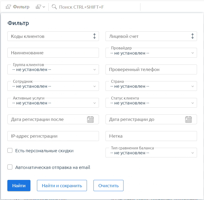 - Задайте условия отбора и нажмите Найти и сохранить.