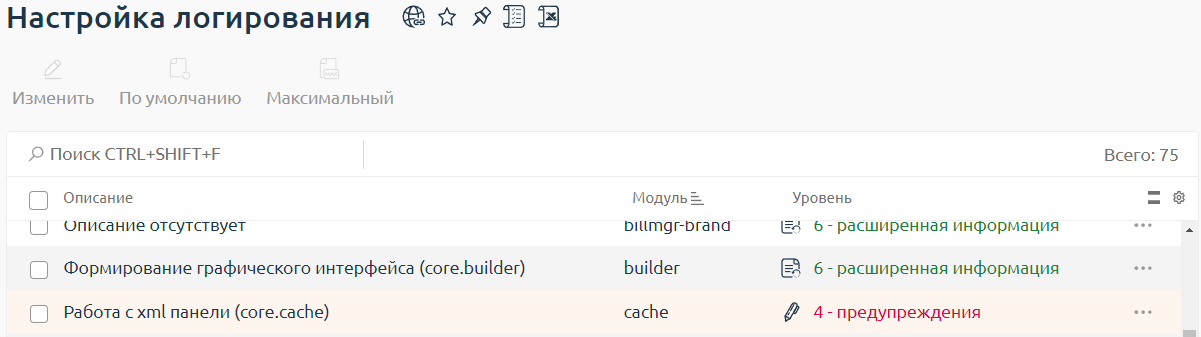 Изменение уровня логирования через веб-интерфейс доступно не для всех лог-файлов, так как они могут отсутствовать в разделе Настройка логирования. Вы можете изменить уровень логирования через добавление записи в файл /usr/local/mgr5/etc/debug.conf. Подробнее см. статью в документации COREmanager Настройка логирования (debug.conf).