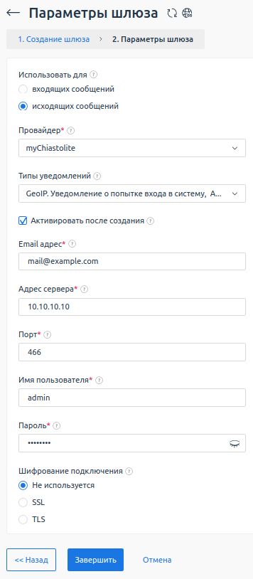 - Параметры шлюза — укажите данные для подключения к удалённому SMTP-серверу: