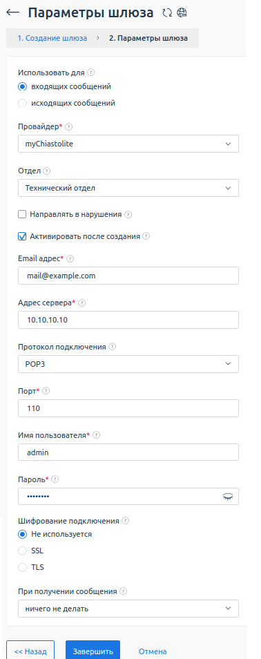 - Параметры шлюза — укажите данные для подключения к удалённому POP3 или IMAP-серверу: