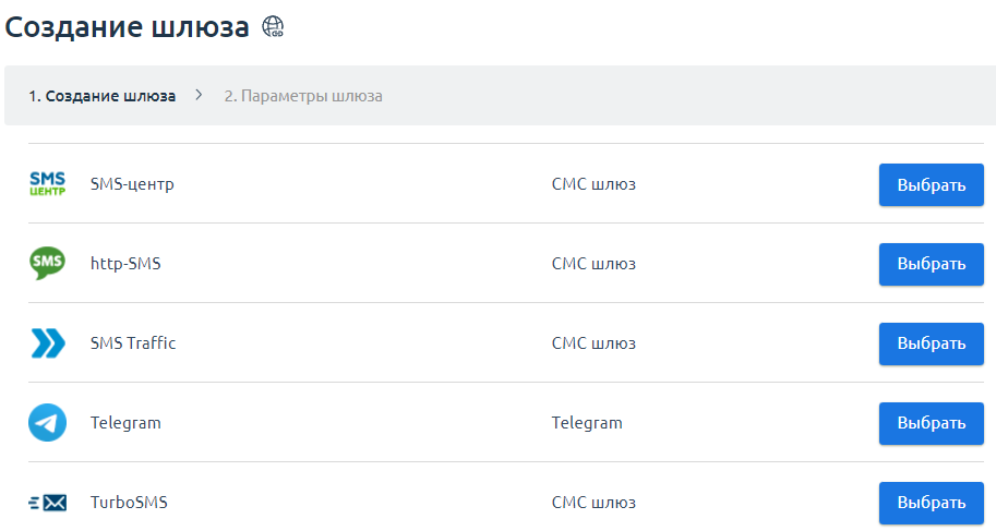 - Создание шлюза — выберите подходящий сервис СМС-рассылок: