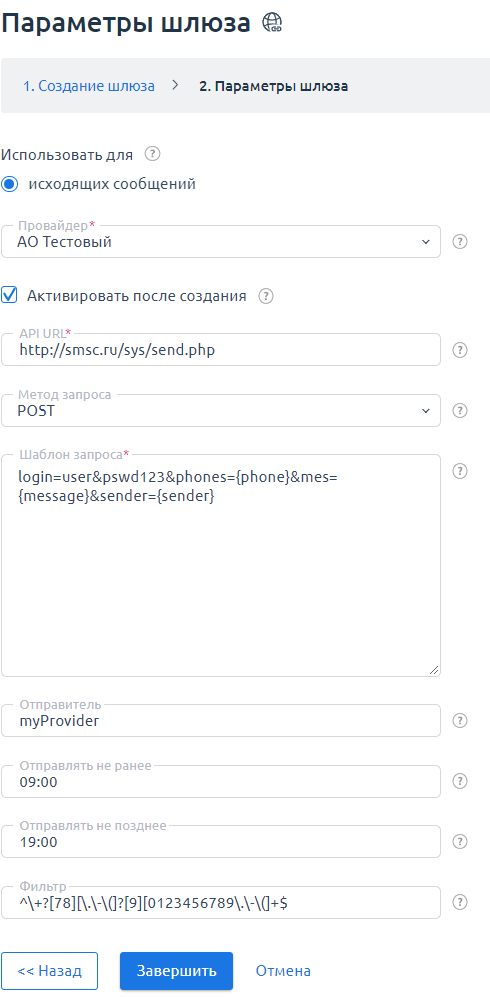 - Фильтр — настройте фильтр адресатов для маршрутизации сообщений через разные шлюзы. Поле поддерживает регулярные выражения.