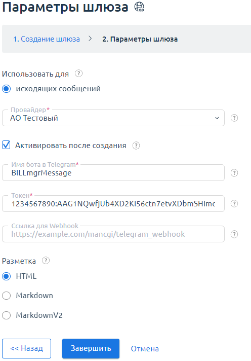 - Введите в поле Ссылка для Webhook адрес вида {CloudenURL}/mancgi/telegram_webhook для получения подтверждений от Telegram. Telegram будет посылать на этот адрес вебхуки о том, что клиент и бот связаны. Вы можете оставить поле пустым. В этом случае будет использоваться адрес сервера с Clouden.