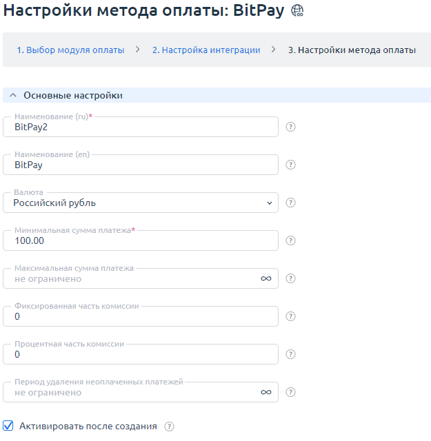 - Настройки метода оплаты. Настройте внутренние (в пределах Clouden) параметры метода оплаты. Подробнее см. шаг 3 в статье Настройка методов оплаты.