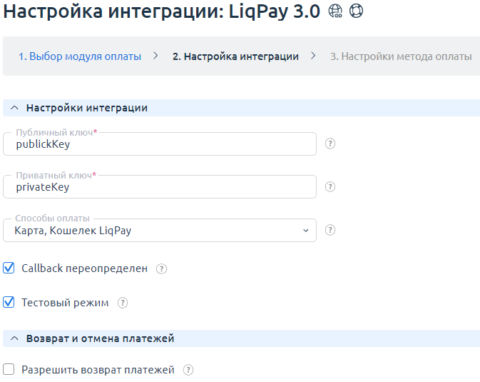 - Приватный ключ — приватный ключ из настроек магазина на стороне LiqPay;