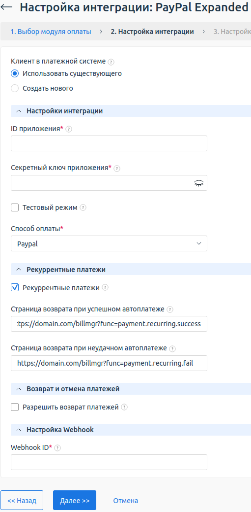 Заполните форму, используя данные существующего клиента в платёжной системе:- ID приложения — уникальный идентификатор приложения. Чтобы узнать его, авторизуйтесь в личном кабинете PayPal и перейдите в раздел Dashboard → REST API apps → параметр приложения Client ID.