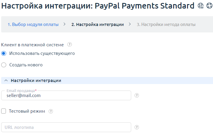 Заполните форму, используя данные существующего клиента в платёжной системе:- Email продавца — email продавца в системе PayPal.