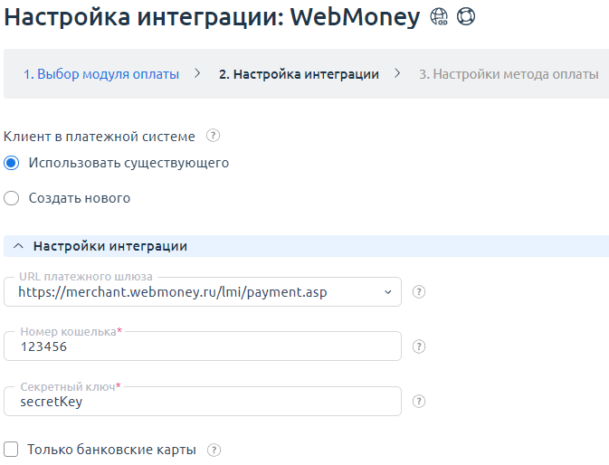 - Секретный ключ — секретный ключ учетной записи в системе WebMoney. Должен совпадать с ключом, указанным на стороне платежной системы.