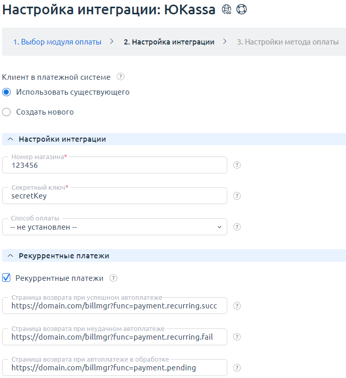 - Страница возврата при успешном автоплатеже — ссылка для возврата из личного кабинета ЮKassa после успешной настройки автоплатежа. Используйте страницу Clouden https://domain.com/billmgr?func=payment.recurring.success или произвольную;