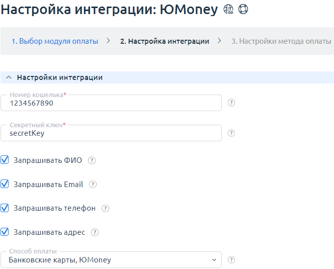 - Выбор модуля оплаты: "ЮMoney (для физических лиц)".