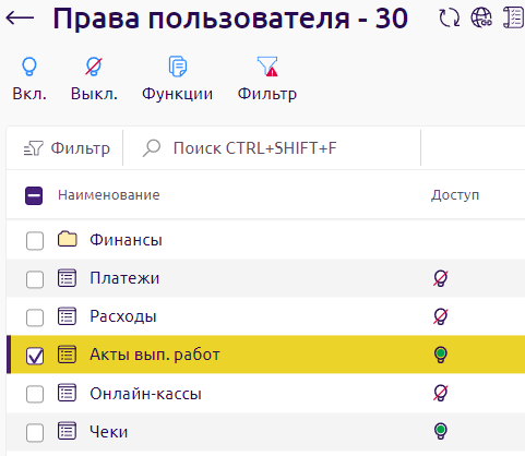 - Выберите в списке раздел и с помощью кнопок Вкл. и Выкл. установите нужный статус доступа.