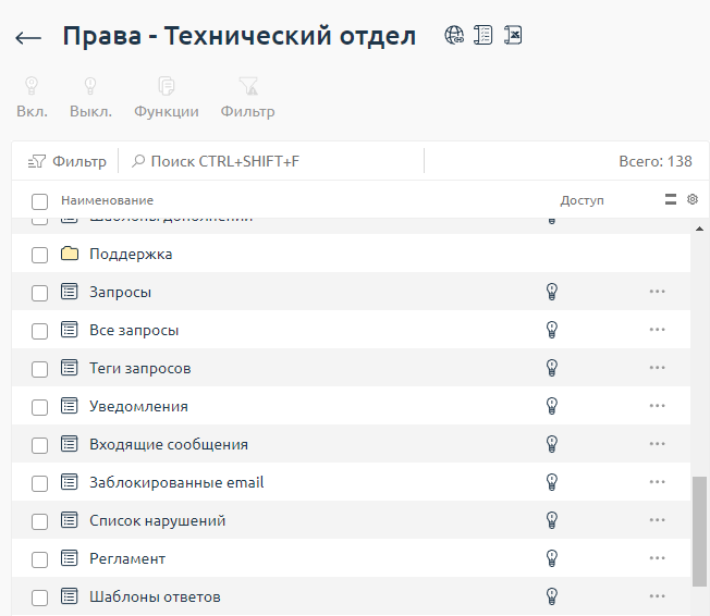 Например, для сотрудников отдела технической поддержки включается доступ только к разделам: