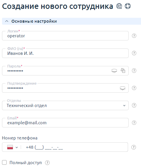- Номер телефона — укажите номер телефона сотрудника. Может быть использован для отправки СМС-уведомлений.