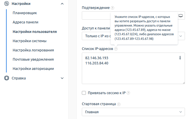 - В разделе Основные настройки в поле Доступ к панели управления выберите значение "Только с IP из списка".