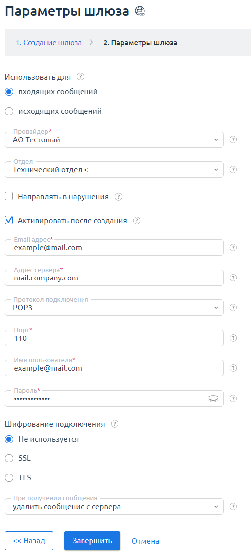 - Шаг 2. Параметры шлюза. На этом этапе указываются данные подключения к удаленному (локальному) POP3/IMAP серверу.