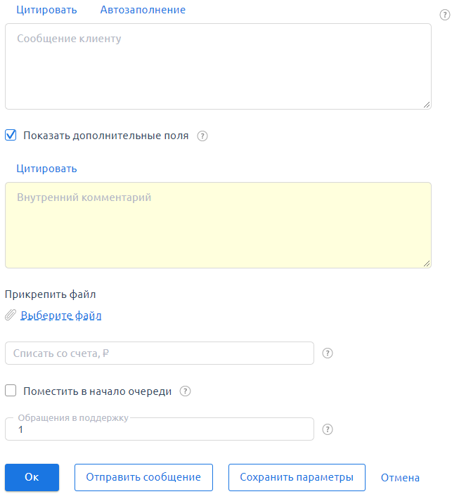 Значение поля Обращения в поддержку указывает на количество обращений, списанных за решение тикета. Уменьшение значения поля приводит к возврату обращений клиенту, увеличение — к дополнительному списанию.