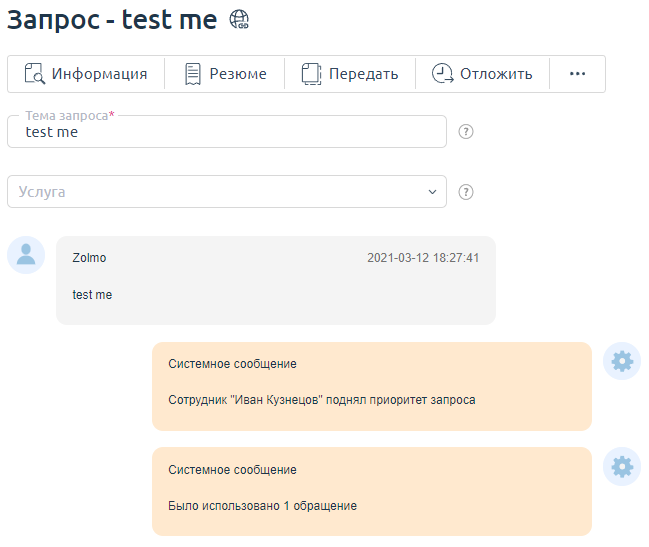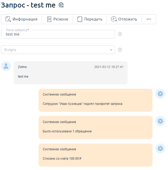 Обращения списываются автоматически при создании запроса в отдел, у которого включена платная поддержка. При списании в тикете появляется системное сообщение: