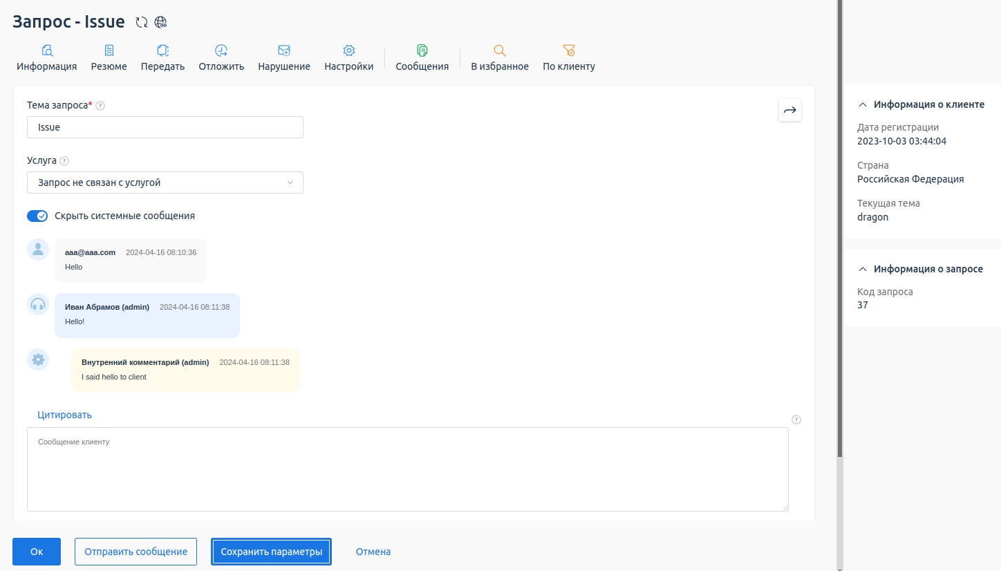 - Сохранить параметры — появляется, если сотрудник внёс изменения в параметры тикета. Например, изменил тему тикета или выбранную услугу. При использовании кнопки Сохранить параметры происходит сохранение измененных параметров. Сообщение из поля ответа или внутреннего комментария при этом не отправляется в тикет;