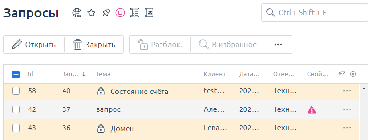 В разделе Поддержка → Запросы клиенту доступны все активные тикеты.