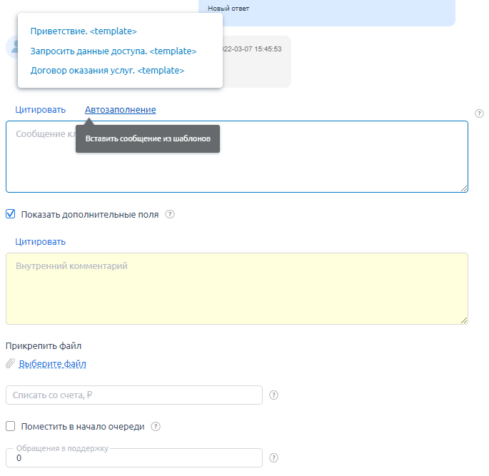 - Автозаполнение — позволяет быстро вставить заранее подготовленный шаблон в поле ответа;
