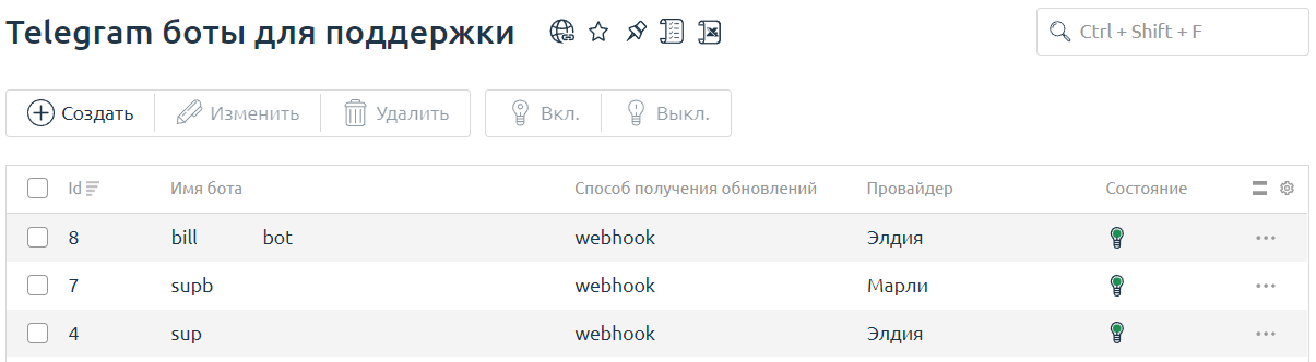 Добавленные Telegram-боты и их состояние отображаются в таблице.