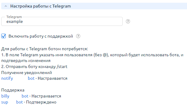 В настройках отображаются включённые боты для получения уведомлений и работы с поддержкой.