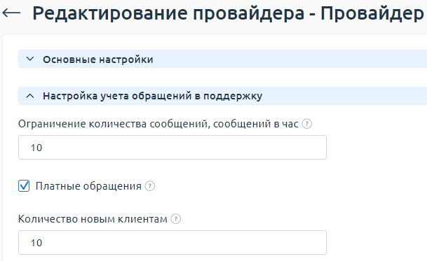 - Перейдите в раздел Провайдер → Провайдеры → выберите провайдера → кнопка Изменить → блок Настройка учёта обращений в поддержку.