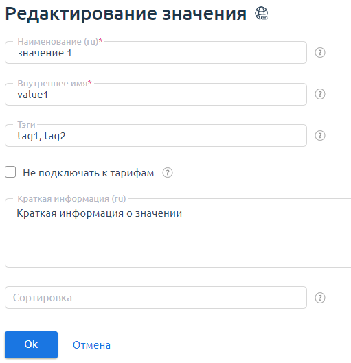 - Краткая информация — описание значения параметра. Отображается на странице заказа услуг.