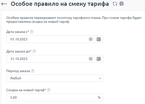 Clouden поддерживает возможность настроить особые правила для перехода на определённый тариф. Особые правила имеют более высокий приоритет перед политикой тарифного плана. При смене тарифа по особым правилам будет предоставлена скидка на новый тариф.