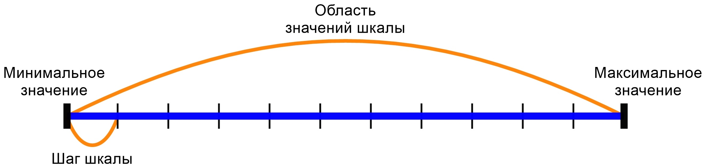 - Область значений шкалы — все варианты, которые клиент может выбрать на шкале. Область значений определяется двумя параметрами — минимальное и максимальное значения. Они указываются в настройках ресурса в блоке Ограничения тарифа → поля Минимальное значение и Максимальное значение. При заказе дополнения клиент не сможет выйти за рамки этих значений.