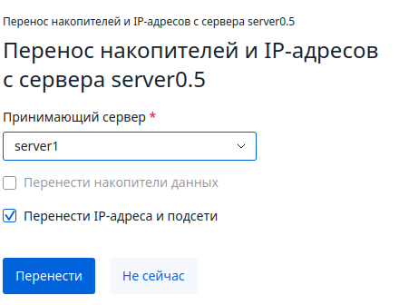 напротив нужного сервера. - В выпадающем меню выберите Перенести накопители и IP-адреса.