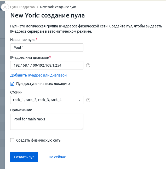 - Выберите Пул для выдачи серверов. IP-адреса из этого пула будут выделяться серверам в стойках, которым не назначен ни один пул.