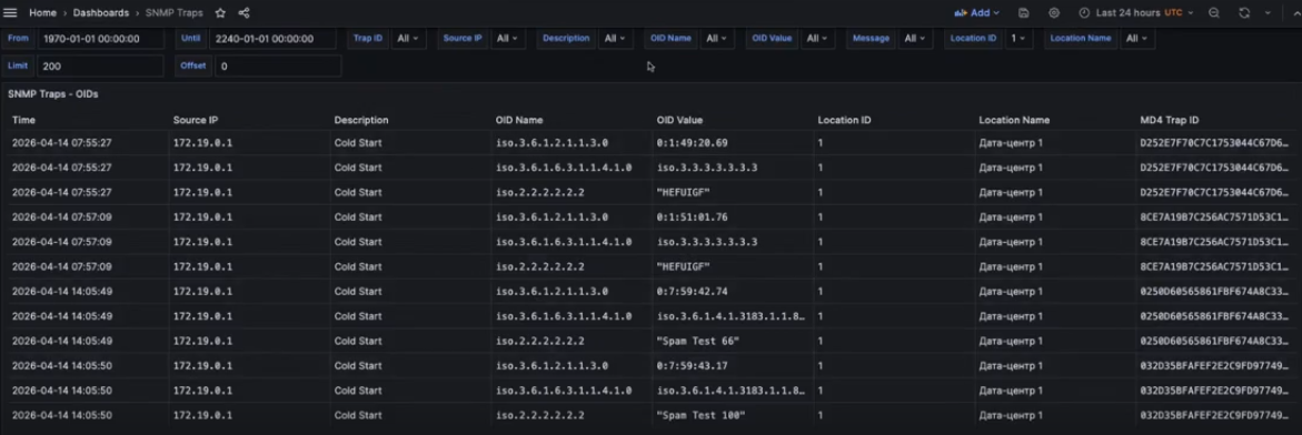 После этого информация из SNMP-сообщений будет отображаться в дашборде Grafana. Для просмотра дашборда нажмите Дашборд SNMP Traps в Grafana в настройках локации. В текущей реализации в дашборде данные о ловушках отображаются в параметрах OID Name и OID Value.