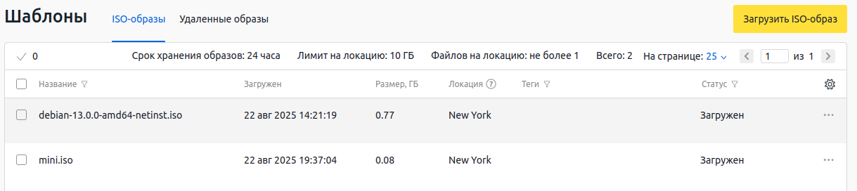 - собственные ISO-образы, загруженные через публичный URL или с локального компьютера. Эти образы не будут доступны другим пользователям.