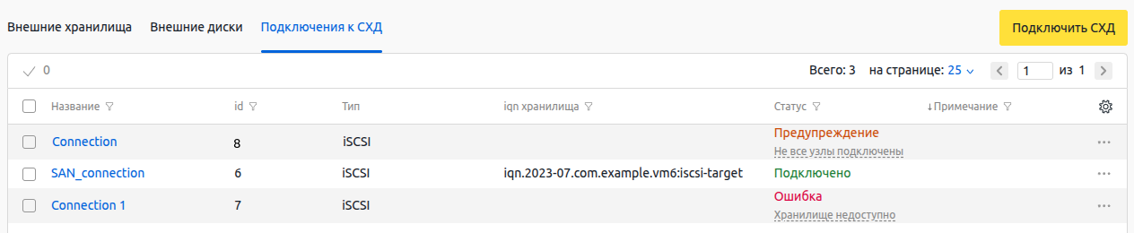 Управление внешним хранилищем выполняется с помощью подключения к СХД. Чтобы управлять подключениями, в левом меню нажмите Внешние хранилища → вкладка Подключения к СХД. Вкладка содержит информацию о созданных подключениях и их состоянии.