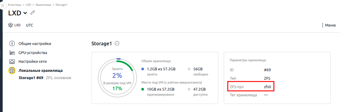 lsblkВ примере имя второго диска vdb, поэтому имя блочного устройства — /dev/vdb.Пример выводаNAME MAJ:MIN RM SIZE RO TYPE MOUNTPOINT loop0 7:0 0 91.9M 1 loop /snap/lxd/32662 loop1 7:1 0 40.9M 1 loop /snap/snapd/20290 loop2 7:2 0 49.3M 1 loop /snap/snapd/24792 loop3 7:3 0 63.3M 1 loop /snap/core20/1828 loop5 7:5 0 73.9M 1 loop /snap/core22/2045 loop6 7:6 0 114.4M 1 loop /snap/lxd/33110 sr0 11:0 1 1024M 0 rom vda 252:0 0 50G 0 disk ├─vda1 252:1 0 1M 0 part └─vda2 252:2 0 50G 0 part / vdb 252:16 0 50G 0 disk - Определите имя пула. Для этого в интерфейсе платформы перейдите в Кластеры → выберите кластер → кнопка Параметры → раздел Локальные хранилища → параметр ZFS-пул.