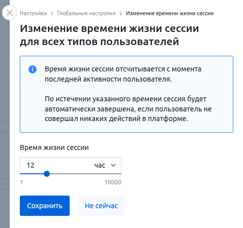 Если в течение определённого периода пользователь не выполнял никаких действий в платформе, его сессия будет завершена. Этот период называется время жизни сессии. Его значение по умолчанию — 60 минут. Вы можете установить время жизни сессии от 1 минуты до 10000 часов.