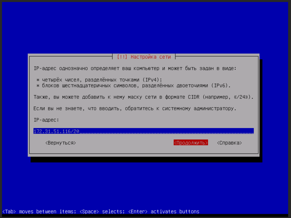 - IPv4-адрес сервера и маску сети в формате CIDR. Например, 192.168.1.10/24.