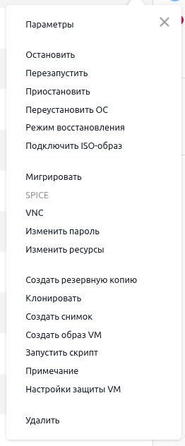 - SPICE — подключиться к рабочему столу ВМ по протоколу SPICE;