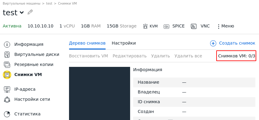 При этом у ВМ нет снимков в веб-интерфейсе (раздел Виртуальные машины → Снимки).