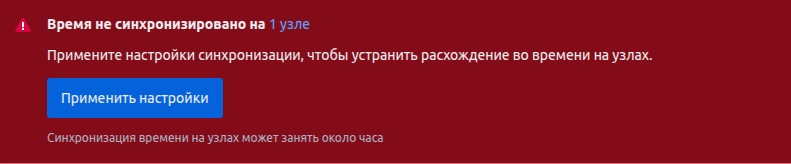 Настройки в правом боковом меню → раздел Глобальные настройки → блок Время. - На баннере-предупреждении Время не синхронизировано на N узлах нажмите кнопку Применить настройки.