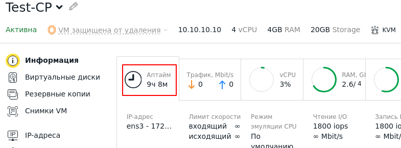 В разделе Виртуальные машины → Параметры → Информация отображается некорректный Аптайм (uptime, непрерывное время работы). Например, отображается значение Аптайм 9 часов, хотя сервер только что запущен.