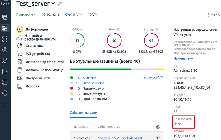 Необходимо изменить имя пользователя, которое используется в платформе для подключенного узла виртуализации. При этом требуется изменить учётную запись в рабочем режиме, без повторного подключения узла.