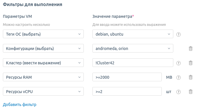 - Укажите Фильтры для выполнения скрипта. Скрипт доступен для запуска на ВМ при совпадении условий всех фильтров. Фильтр Теги ОС является обязательным, остальные — опциональными. Чтобы добавить больше фильтров, нажмите кнопку Добавить фильтр. Чтобы удалить фильтр, нажмите значок