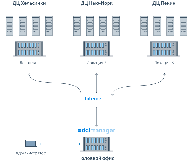 Локации изолированы друг от друга. Каждая дата-центр связан только с центральной платформой DCImanager, при этом доступ исключительно односторонний — из DCImanager к локациям.