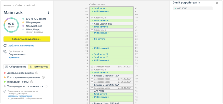 DCImanager позволяет отслеживать температуру серверов в режиме реального времени. Система собирает данные с температурных датчиков, установленных в серверах, и отображает их в карточке сервера и на карте стойки. Частота сбора данных — от двух минут. Показатель можно настроить индивидуально для каждого сервера.