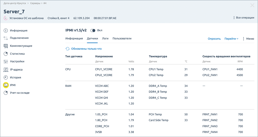Благодаря возможности подключения к BMC платформа получает расширенные данные о состоянии оборудования. DCImanager собирает информацию о напряжении, скорости вращения вентиляторов и других важных параметрах.